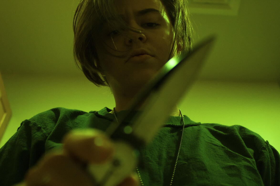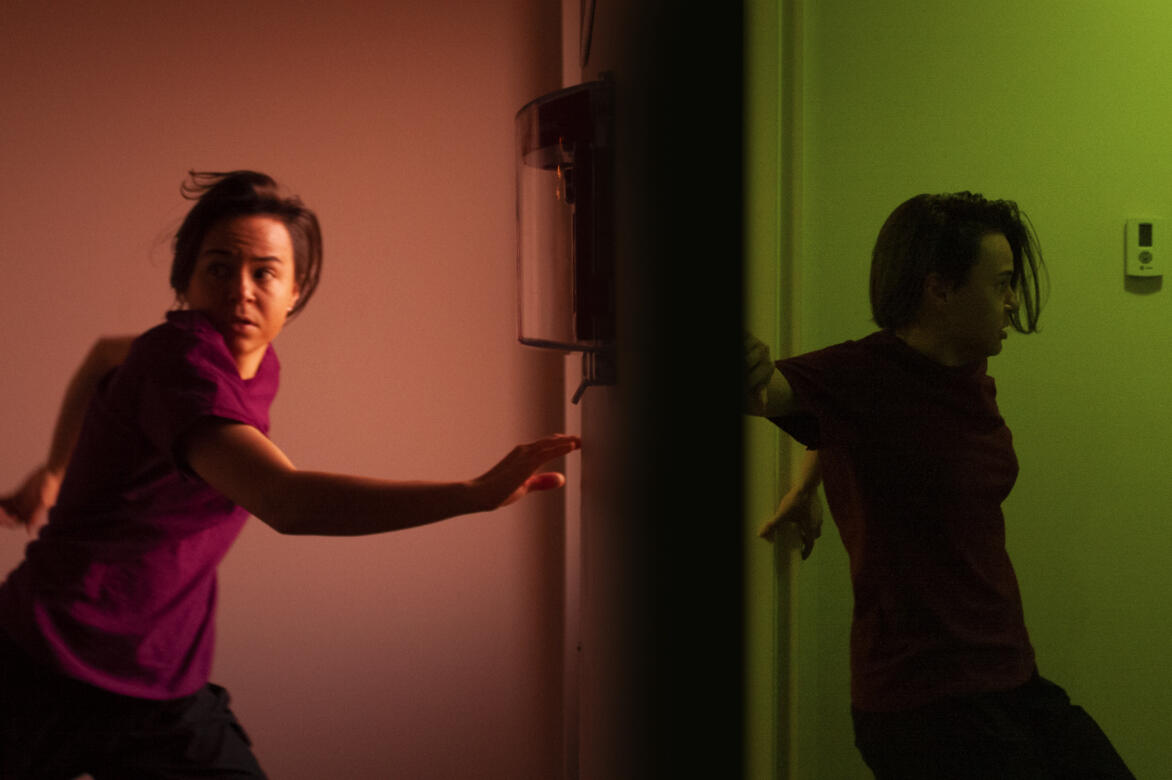 In this narrative series, I’m attempting to respond to the ways in which The Cook, The Thief, His Wife & Her Lover implies such a dramatic cat-and-mouse narrative when imagining that the dialogue is removed. Based on the general plot structure of the film, my narrative follows the Main Character (played by me) as they try to break free from a place of captivity, while being chased and hunted by their captor. I am the only character on camera, so the entire narrative is told through my expressions, actions, and movement, and through color-coded lighting. I utilize a saturated red-green complementary color motif inspired directly from the film to indicate presence of danger or safety, such colors present in both lighting and costume.